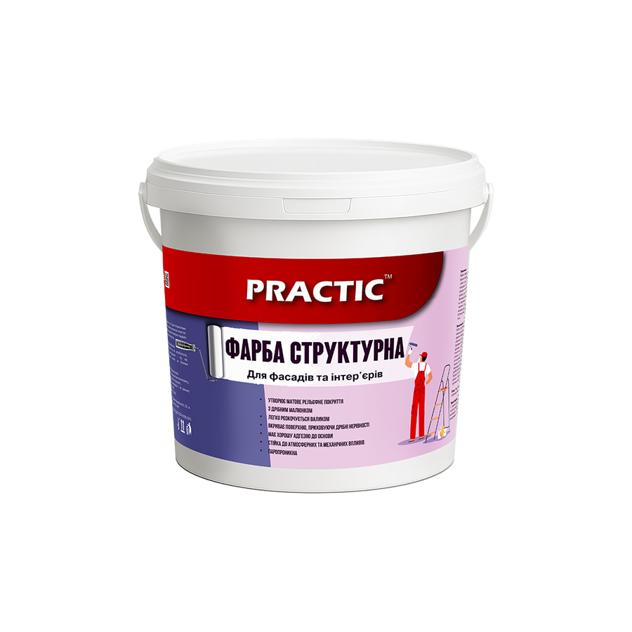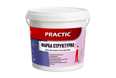 Фарба PRACTIC СТРУКТУРНА, готова до застосування. Для фарбування фасадів будинків, підвалів, сходових прольотів, торгівельних залів, складів тощо. Для фарбування зовні та всередині приміщень із підвищеною вологістю. Легко колерується пігментами. Можливе застосування для оздоблення інтер'єру не тільки як самостійний матеріал, але і в різних поєднаннях (в комплексі) з іншими декоративними лакофарбовими матеріалами (шпаклівками, лаками, гладкими фарбами).
