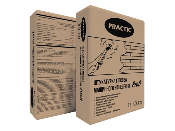 Штукатурна суміш ТМ «PRACTIC» на основі гіпсово-вапняного в'яжучого застосовується для високоякісного штукатурення стін та стель механічним засобом що забезпечує значну перевагу в порівнянні з ручним нанесенням, особливо при великих об'ємах робіт. Використовується по поверхнях різного складу всередині приміщень. Використовується також для робіт ручним способом.